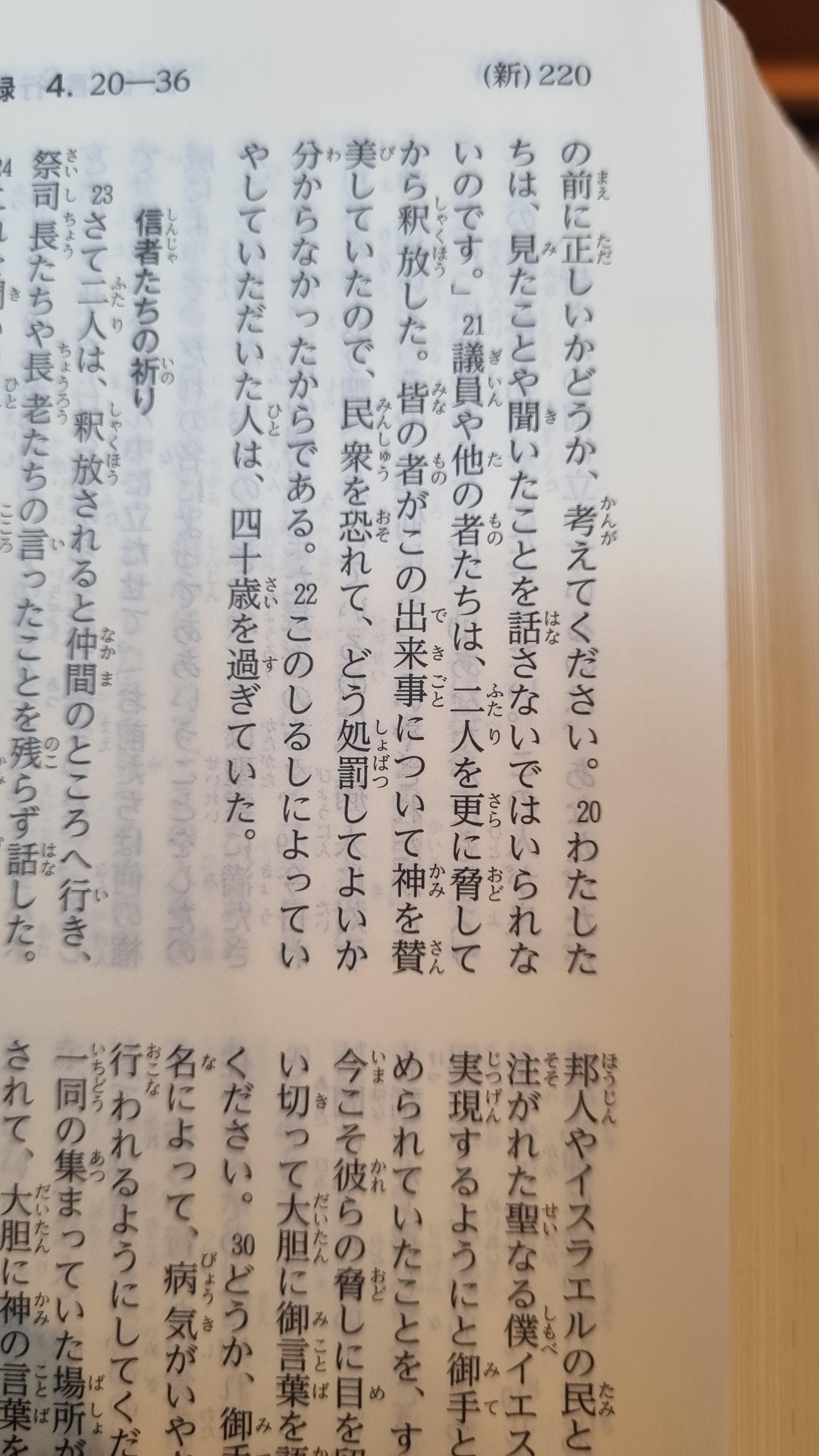 일본 성경은 세로로 쓰여진 구조인 데다 오른쪽에서 왼쪽으로 읽는 구조다. 아마 일본어로 쓰여진 소설을 보신 분이라면 알듯... 소설도 세로 쓰기에 오른쪽에서 왼쪽으로 읽는 구조라 하니까.